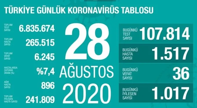 Son dakika haberleri... Türkiye koronavirüsle mücadelede aldığı önlemlerle vaka sayısını kontrol altında tutmaya devam ediyor. Sağlık Bakanı Fahrettin Koca da her gün koronavirüs vaka ve vefat sayılarını son dakika olarak açıklıyor. Vatandaşların merakla beklediği 28 Ağustos 2020 koronavirüs verilerinin olduğu tablo Bakan Koca tarafından açıklandı. Açıklanan tabloya göre 28 Ağustos'a ait yeni vaka sayısı 1517, can kaybı ise 36 oldu.