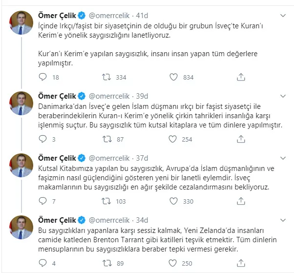 Ömer Çelik, sosyal medya hesabından yaptığı paylaşımda "İçinde Irkçı/faşist bir siyasetçinin de olduğu bir grubun İsveç'te Kuran'ı Kerim'e yönelik saygısızlığını lanetliyoruz." dedi.