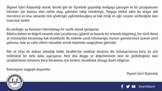 Diyanetten yapılan yazılı açıklamada, medyaya yansıyan ve bir çocuğun istismarı söz konusu olan vahim olayın yakından takip edildiği bildirildi. Açıklamada, "Yargıya intikal eden bu olayın adli mercilerce en kısa zamanda tüm yönleriyle aydınlatılacağına ve hak ettiği en ağır cezanın verileceğine olan inancımız tamdır. Bu vesileyle, şu hususları hatırlatmayı bir vazife olarak görüyoruz; Allah'ın bizlere en değerli emaneti olan çocuklarımız, güvenli ve huzurlu bir ortamda büyümeyi, her türlü ihmal ve istismardan korunmayı hak etmektedir. Bu nedenle çocuk istismarıyla, masum yavrularımıza uzanan şeref yoksunu, hain ve zalim ellerle mücadele etmek hepimizin vazgeçilmez görevidir. İlim ve irfan ile alakası olmadığı halde, kendilerine menfaat devşiren din istismarcılarına karşı da aziz milletimizi bir defa daha uyarıyoruz. Hem dini duygu ve değerlerimizin hem de gözbebeğimiz olan çocuklarımızın istismara karşı korunması için herkesi sorumluluk almaya davet ediyoruz." denildi.