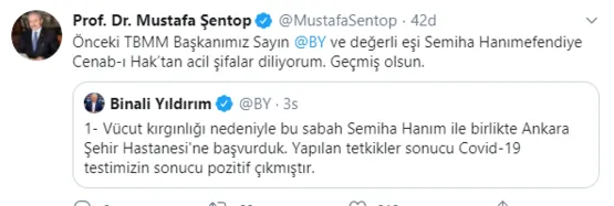 Şentop, sosyal medya hesabı Twitter'dan yaptığı açıklamada, "Önceki TBMM Başkanımız Sayın Binali Yıldırım ve değerli eşi Semiha hanımefendiye Cenab-ı Hak'tan acil şifalar diliyorum. Geçmiş olsun." ifadelerini kullandı.