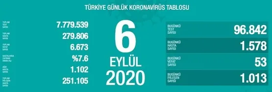 7 EYLÜL KORONAVİRÜS TABLOSU