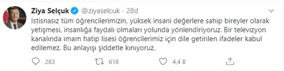 Milli Eğitim Bakanı Ziya Selçuk, Erol Mütercimler'in bir televizyon kanalında sarf ettiği skandal sözlere sosyal medya hesabından tepki gösterdi. Selçuk sosyal medya hesabından yaptığı paylaşımda Mütercimler'in skandal sözlerini kınarken, "İstisnasız tüm öğrencilerimizin, yüksek insani değerlere sahip bireyler olarak yetişmesi, insanlığa faydalı olmaları yolunda yönlendiriyoruz. Bir televizyon kanalında imam hatip lisesi öğrencilerimiz için dile getirilen ifadeler kabul edilemez." ifadelerini kullandı.