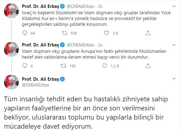 İsveç'in başkenti Stockholm'de Kur'an-ı Kerim'e yönelik saldırılar, kameralara yansımıştı. Bu görüntülere tepki ise gecikmedi. Diyanet İşleri Başkanı Erbaş, Twitter hesabından bu çirkin saldırıyı düzenleyenleri kınadı. Başkan Erbaş, "İslam düşmanı ırkçı grupların Avrupa'nın farklı şehirlerinde Müslümanları hedef alan saldırılarına devam etmesi kaygı verici bir durumdur." ifadelerine yer verdi.