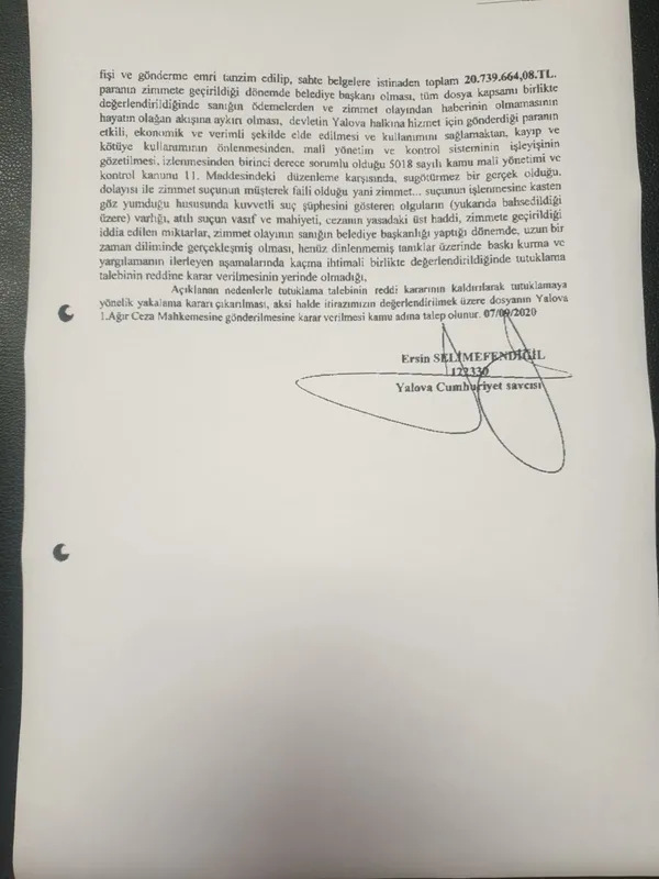 Yalova Cumhuriyet Savcısı Ersin Selimefendigil'in; Yalova 2. Ağır Ceza Mahkemesine gönderdiği yazı şöyle: