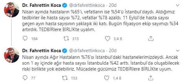 Bakan Koca, Twitter hesabından yaptığı açıklamada, "Nisan ayında hastaların yüzde 65'i, vefatların ise yüzde 54'ü İstanbul'daydı. Aldığımız tedbirler ile hasta sayısı yüzde 72, vefatlar yüzde 78 azaldı. 11 Eylül'de hasta sayısı geçen ayın hasta sayısının yaklaşık iki katı. Bugün filyasyon ekip sayımızı yüzde 34 artırdık. Tedbirlere birlikte uyalım" ifadelerini kullandı.