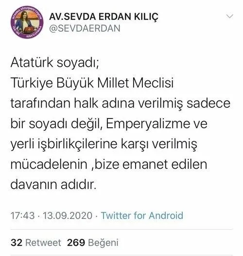 CHP İzmir Milletvekili avukat Sevda Erdan Kılıç da; Canan Kaftancıoğlu'nu isim vermeden eleştirdi ve "Atatürk soyadı; Türkiye Büyük Millet Meclisi tarafından halk adına verilmiş sadece bir soyadı değil, emperyalizme ve yerli işbirlikçilerine karşı verilmiş mücadelenin, bize emanet edilen davanın adıdır" ifadelerini kullandı.
