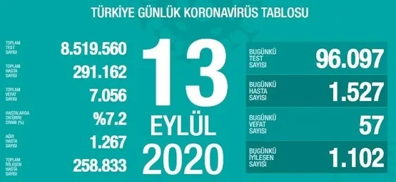 Sağlık Bakanlığının Covid-19 bilgilendirme sayfasında Türkiye'nin güncel korona virüs tablosu kamuoyuyla paylaşıldı. Tabloya göre son 24 saatte 57 kişi korona virüsten hayatını kaybetti, toplam can kaybı 7 bin 56'ya yükseldi. Bugün toplam 96 bin 97 test yapılırken, bin 527 yeni vaka tanısı konuldu. Toplam vaka sayısı 291 bin 162 oldu. Bugün iyileşen bin 102 kişiyle birlikte toplam iyileşen hasta sayısı 258 bin 833'e yükseldi. Toplam hastalarda zatürre oranının yüzde 7.2, toplam ağır hasta sayısının ise bin 267 olduğu açıklandı.