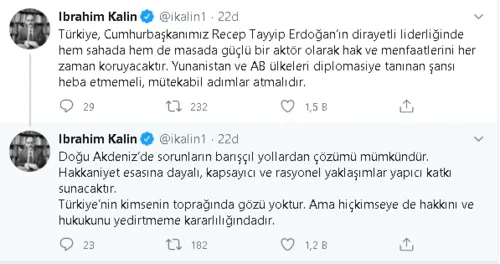 Kalın, Twitter hesabından yaptığı paylaşımda, Yunanistan ve AB ülkelerinin diplomasiye tanınan şansı heba etmemesi ve mütekabil adımlar atmaları gerektiğini belirtti.