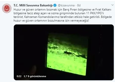 Açıklamada " Huzur ve güven ortamını bozmak için Barış Pınarı bölgesine ve Fırat Kalkanı bölgesine taciz ateşi açan ve sızma girişiminde bulunan 11 PKK/YPG'li terörist, Kahraman Komandolarımız tarafından etkisiz hale getirildi. Bölgede huzur ve güven ortamının bozulmasına izin vermeyeceğiz! "ifadeleri kullanıldı.