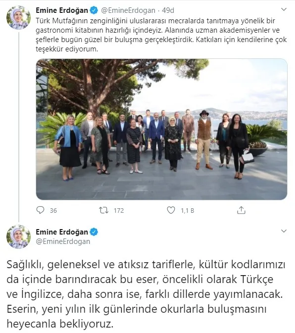 Başkan Recep Tayyip Erdoğan'ın eşi Emine Erdoğan himayesinde hazırlanan "Asırlık Tariflerle Türk Mutfağı" kitabı, Türkiye'nin yemek kültürünü dünyaya tanıtacak. Sağlıklı, geleneksel ve atıksız tariflerle gastronomi literatürüne katkı sağlanması amacıyla "Asırlık Tariflerle Türk Mutfağı" kitabı Emine Erdoğan öncülüğünde, dünyanın dört bir yanındaki gastronomi okurlarına sunulacak. Kitabın ilk etapta İngilizce ve Türkçe olacağı, ilerde farklı dillere de çevrileceği belirtildi. Emine Erdoğan ise bu güzel haberi sosyal medya hesabından takipçileriyle paylaştı.