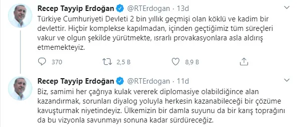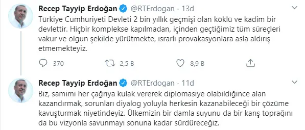 Erdoğan paylaşımında, "Samimi her çağrıya kulak vererek diplomasiye alan kazandırma,sorunları diyalog yoluyla herkesin kazanabileceği çözüme kavuşturma niyetindeyiz. Hiçbir komplekse kapılmadan, içinden geçtiğimiz süreçleri vakur ve olgun şekilde yürütmekte, ısrarlı provokasyonlara aldırış etmemekteyiz." ifadelerini kullandı.