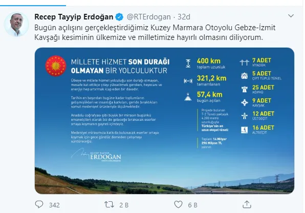 Yatırımın toplam değerinin 14 milyar 296 milyon lira olduğu kaydedilen grafikte, Erdoğan'ın bugün canlı bağlantı ile katıldığı açılış töreninde yaptığı konuşmadan ifadeler de yer aldı.