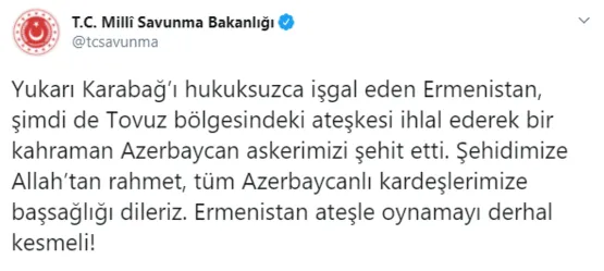 Milli Savunma Bakanlığı, Ermenistan'ın Tovuz bölgesindeki ateşkesi ihlal ederek bir Azerbaycan askerini şehit etmesi üzerine bir mesaj yayımladı." Şehidimize Allah'tan rahmet, tüm Azerbaycanlı kardeşlerimize başsağlığı dileriz" ifadelerine yer verilen mesajda Ermenistan'a bir mesaj vardı. MSB'den yapılan açıklamada: Ermenistan ateşle oynamayı derhal kesmeli! sözleriyle Ermenistan'a net bir mesaj verildi.