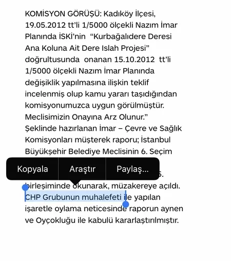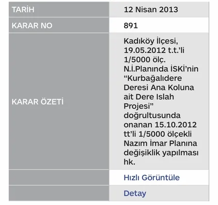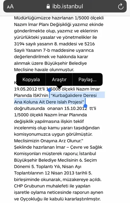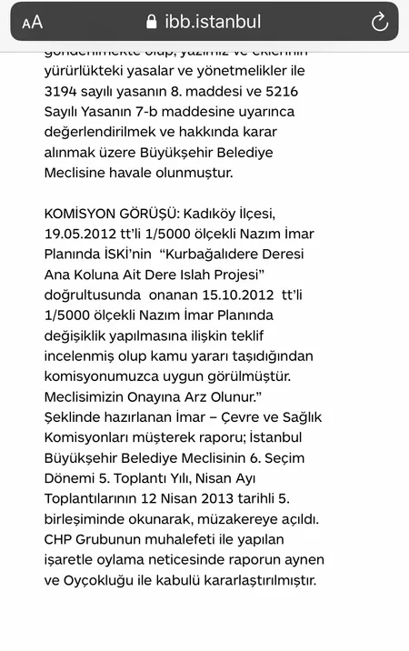 AK Partili İBB, 12 Nisan 2013'te İSKİ'nin Kadıköy ilçesinde bulunan Kurbağalıdere Deresi Ana Koluna Ait Dere Islah Projesi'ni İBB Meclisi'ne sundu. CHP'li İBB Meclis üyeleri ıslah projesine ret oyu verdi. Kararda, "12 Nisan 2013 tarihli 5. birleşiminde okunarak, müzakereye açıldı. CHP Grubunun muhalefetiyle yapılan işaretle oylama neticesinde raporun aynen ve oyçokluğu ile kabulü kararlaştırılmıştır" denildi.