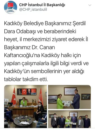 Canan Kaftancıoğlu parti içerisinden aldığı tepkilere rağmen bugün CHP İstanbul İl Başkanlığına ait twitter hesabından paylaşılan fotoğrafla tekrar gündeme geldi. Söz konusu hesaptan yapılan bir paylaşımda Kadıköy Belediye Başkanı Şerdil Dara Odabaşı ile birlikte bir heyetin CHP İl Başkanlığına ziyarette bulunduğuna yönelik paylaşım yapıldı.