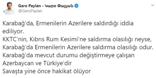 Paylan, sosyal medya hesabından yaptığı açıklamada "Karabağ'da, Ermenilerin Azerilere saldırdığı iddia ediliyor.KKTC'nin, Kıbrıs Rum Kesimi'ne saldırma olasılığı neyse, Karabağ'da Ermenilerin Azerilere saldırma olasılığı odur.Karabağ'da mevcut durumu değiştirmeye çalışan Azerbaycan ve Türkiye'dir Savaşta yine önce hakikat ölüyor" ifadelerini kullandı.