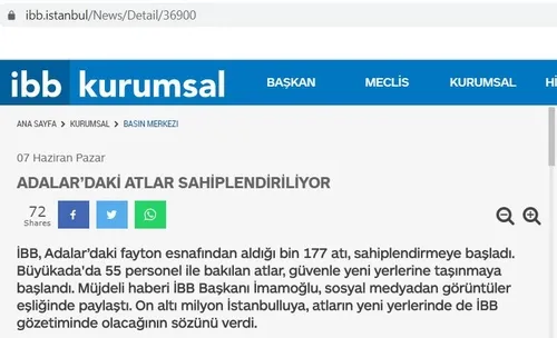 İBB Başkanı İmamoğlu, resmi Twitter hesabından 19 Haziran 2020'de yaptığı paylaşımında "Adalar'da Atların hepsini satın alıp sağlıklarına kavuşturduk, bakımlarını yaptık, sahiplendiriyoruz. Ulaşım doğa dostu elektrikli araçlarla sağlanacak. Çalışanlar Adalar sakinleri olacak. Tüm yolların bakım ve onarımını yaptık. Tüm Adalar'da kapsamlı temizlik yaptık" ifadelerini kullanmıştı.