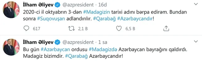 Aliyev, Twitter hesabından yaptığı açıklamada, "Madagiz'in tarihi adını 3 Ekim 2020'den itibaren geri kazandırıyorum. Bundan böyle Sugovuşan olarak anılacaktır. Karabağ Azerbaycan'dır!" ifadelerini kullandı.