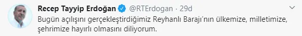 Cumhurbaşkanı Erdoğan, Twitter hesabından yaptığı paylaşımda, "Bugün açılışını gerçekleştirdiğimiz Reyhanlı Barajı'nın ülkemize, milletimize, şehrimize hayırlı olmasını diliyorum." ifadelerini kullandı.
