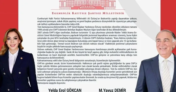 Açıklamada ayrıca şu ifadelere yer verildi: "2007 yılında CHP'li Ağan tarafından, Bodrum turizminin 12 aya çıkarılması yönünde Maden Tetkik Arama Enstitüsü Genel Müdürlüğüne başvuru yapılarak bölgedeki jeotermal kaynakların aranması istenmiş, buna ilişkin çalışmalar da yine MTA tarafından başlatılmıştır. O dönem CHP'li belediye başkanı; 'Kara Ada'nın içinden binlerce yıldır denize akan termal su kaynağının bulunduğu yere kapalı havuz ve tesis yaparak yılın 12 ayı kullanabilir hale getireceğiz. Termal turizm Bodrum için dönüm noktası olacak' ifadeleriyle jeotermal çalışmalarını büyük bir müjde şeklinde kamuoyuyla paylaşmıştı. Gelinen noktada, CHP Genel Başkan Yardımcısının kamuoyunu kandırmaya yönelik açıklamaları şark kurnazlığından başka bir şey değildir. Sanki ilk kez büyük bir keşif yapmış gibi, bölge muhalefet milletvekillerinin de kullanılması en basit deyimiyle acizliktir, basiretsizliktir. CHP'nin gelişime ve yatırımlara karşı olduğu tüm kamuoyunca da bilinmektedir.