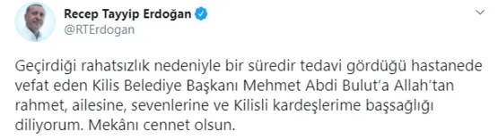 Başkan Recep Tayyip Erdoğan hayatını kaybeden Kilis Belediye Başkanı ı Mehmet Abdi Bulut için taziye mesajı yayımladı. Başkan Erdoğan paylaşımında: "Geçirdiği rahatsızlık nedeniyle bir süredir tedavi gördüğü hastanede vefat eden Kilis Belediye Başkanı Mehmet Abdi Bulut'a Allah'tan rahmet, ailesine, sevenlerine ve Kilisli kardeşlerime başsağlığı diliyorum. Mekânı cennet olsun." ifadelerini kullandı.