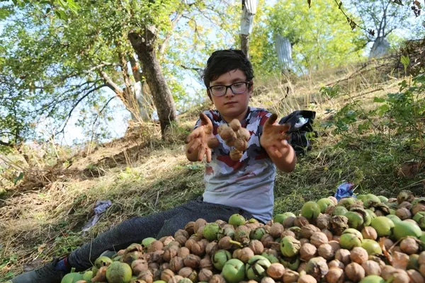 Ailenin ceviz hasadına küçük kardeşi Ali ile yardım ettiklerini söyleyen Ayaz Yıldız, "Ben on bir yaşındayım. Kardeşim Ali ile beraber ailemize yardım ediyoruz. Ceviz bitene kadar geliyoruz. Akşam da eve gittiğimizde topladığımız cevizleri pay ediyoruz" diye konuştu.