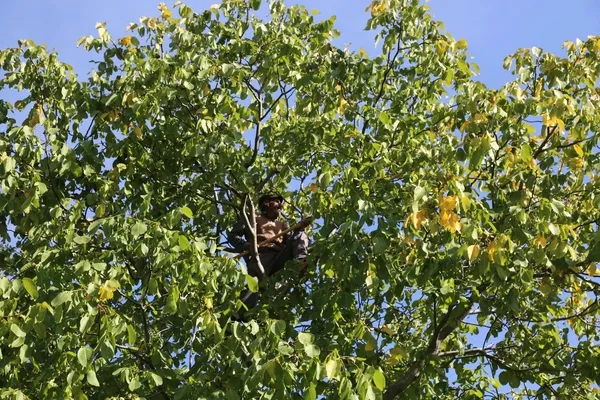 En zor ve zahmetli olan silkeleme işini ailenin 65 yaşındaki babası Nuri Yıldız yapıyor. Metrelerce yükseklikteki ağaçlara tırmanarak uzun sırık yardımıyla cevizleri silkeleyen Nuri Yıldız, işin zahmetli ve riskli olduğunu söylüyor.