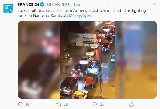 Son aylarda Ermenistan ile Azerbaycan arasında yaşanan gerilimlerin ardından Türkiye'de farklı illerde vatandaşlar Azerbaycan'a destek için bayraklarıyla sokağa çıkmıştı. Bu durumu hazmedemeyen Fransız devlet kanalı France 24, 5 Ekim tarihinde çekildiği iddia edilen konvoy görüntülerini "Türkler, Ermeni mahallesine baskın düzenledi" başlığıyla duyurdu.