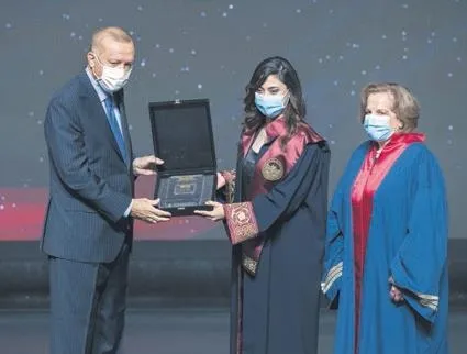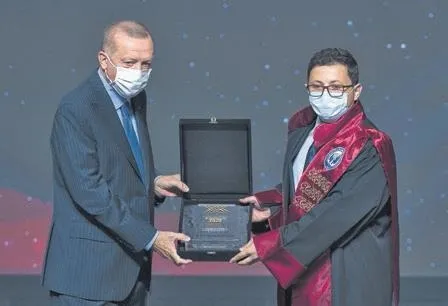 CUMHURBAŞKANI Erdoğan, törende hazırladıkları doktora tezleri ile 'YÖK Üstün Başarı Ödülü'ne layık görülenlere ödüllerini takdim etti. Sosyal ve Beşeri Bilimler kategorisinde Dr. Öğr. Üyesi Melikşah Arslan ve tez danışmanı Doç. Dr. Saime Selenga Gökgöz, Fen ve Mühendislik Bilimleri kategorisinde Dr. Öğr. Üyesi Ece Ekşin ve tez danışmanı Prof. Dr. Kadriye Arzum Erdem Gürsan, Sağlık Bilimleri kategorisinde Dr. Öğr. Üyesi Ayşe Nur Oktay ve tez danışmanı Prof. Dr. Fatma Nevin Çelebi ödül almaya hak kazandı. Yerel Kalkınmaya Katkı Ödülü, "Kırsalda Gezici Hayvan Sağlığı, Poliklinik ve Eğitim Hizmetlerinin Sağlanması" başlıklı başvurusu ile Atatürk Üniversitesi'ne verildi. Üniversite-Sanayi İşbirliği Ödülü, İstanbul Teknik Üniversitesi'ne, Uluslararası İşbirliği Ödülü ise Ankara Üniversitesi'ne verildi.