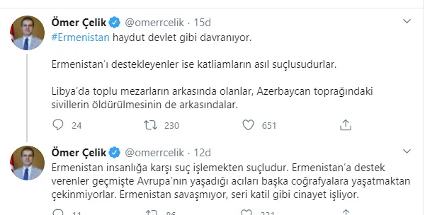 AK Parti Sözcüsü Ömer Çelik sosyal medya hesabından yaptığı paylaşımda, Ermenistan ordusunun Azerbaycan'da sivillere yönelik saldırılarına ilişkin, "Ermenistan haydut devlet gibi davranıyor. Ermenistan'ı destekleyenler ise katliamların asıl suçlusudurlar. Libya'da toplu mezarların arkasında olanlar, Azerbaycan toprağındaki sivillerin öldürülmesinin de arkasındalar. Ermenistan insanlığa karşı suç işlemekten suçludur. Ermenistan'a destek verenler geçmişte Avrupa'nın yaşadığı acıları başka coğrafyalara yaşatmaktan çekinmiyorlar. Ermenistan savaşmıyor, seri katil gibi cinayet işliyor" paylaşımında bulundu.
