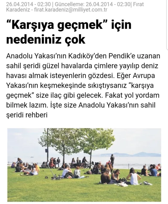 Milliyet Gazetesi'nde 26 Nisan 2014 tarihinde yayınlanan "Karşıya geçmek" için nedeniniz çok" başlıklı haberde; "Anadolu Yakası'nın Kadıköy'den Pendik'e uzanan sahil şeridi güzel havalarda çimlere yayılıp deniz havası almak isteyenlerin gözdesi. Eğer Avrupa Yakası'nın keşmekeşinde sıkıştıysanız 'karşıya geçmek' size ilaç gibi gelecek. Fakat yol yordam bilmek lazım. İşte size Anadolu Yakası'nın sahil şeridi rehberi" denildi.