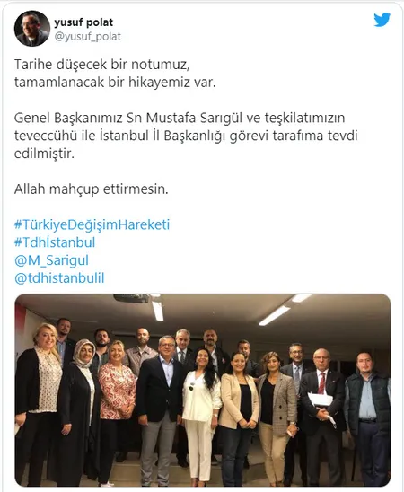 Twitter hesabından bir paylaşımda bulunan Yusuf Polat, Mustafa Sarıgül'e teşekkür ederek, "Tarihe düşecek bir notumuz, tamamlanacak bir hikayemiz var. Genel Başkanımız Sn Mustafa Sarıgül ve teşkilatımızın teveccühü ile İstanbul İl Başkanlığı görevi tarafıma tevdi edilmiştir. Allah mahçup ettirmesin" ifadelerini kullandı.