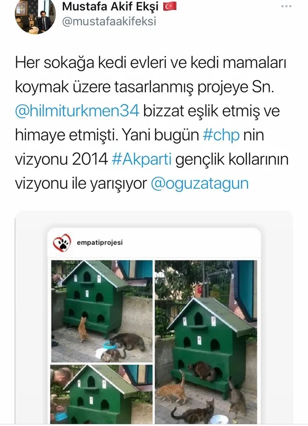 CHP’li Ekrem İmamoğlu, AK Partili Üsküdar Belediyesi’ne ait olan ve sokak hayvanları için uygulanan empati isimli projeyi iki harf değiştirerek kendi projesi “semtpati”olarak sundu. Projenin mimarlarından AK Parti Üsküdar Eski Gençlik Kolları Başkanı Mustafa Akif Ekşi, sosyal medya hesabından duruma tepki gösterdi. Ekşi, “Her sokağa kedi evleri ve kedi mamaları koymak üzere tasarlanmış projeye Sayın Hilmi Türkmen bizzat eşlik etmiş ve himaye etmişti. Yani bugün CHP’nin vizyonu 2014 AK Parti Gençlik Kolları’nın vizyonu ile yarışıyor” dedi.