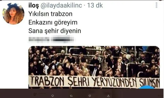 CHP Isparta İl Gençlik Kolları Başkan Yardımcısı İlayda Kılınç, dün akşam oynanan Fenerbahçe- Trabzonspor derbisi öncesi Twitter'daki 'ilaydaakilinc' adlı hesabından, Trabzon ve Trabzonsporlulara yönelik ağır hakaret içeren paylaşım paylaştı. Kılınç'ın tribünde açılan 'Trabzon şehri yer yüzünden silinsin' yazılı fotoğrafı paylaşarak, 'Yıkılsın Trabzon, enkazını göreyim. Sana şehir diyenin...' şeklinde ifadeler kullandı. İlayda Kılınç'ın paylaşımı kısa sürede çok sayıda tepki aldı. Bunun üzerine İlayda Kılınç, paylaşımını kaldırdı.