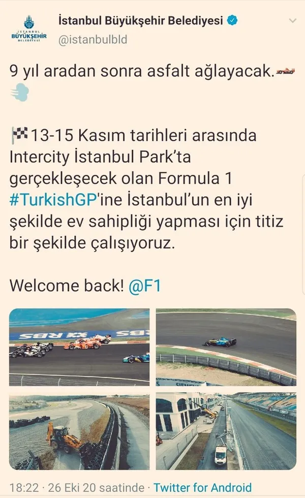 İBB'nin @istanbulbld isimli resmi Twitter hesabından yapılan fotoğraflı paylaşımda şu cümleler kullanıldı: "9 yıl aradan sonra asfalt ağlayacak. 13-15 Kasım tarihleri arasında Intercity İstanbul Park'ta gerçekleşecek olan Formula 1 #TurkishGP'ine İstanbul'un en iyi şekilde ev sahipliği yapması için titiz bir şekilde çalışıyoruz. Welcome Back!"