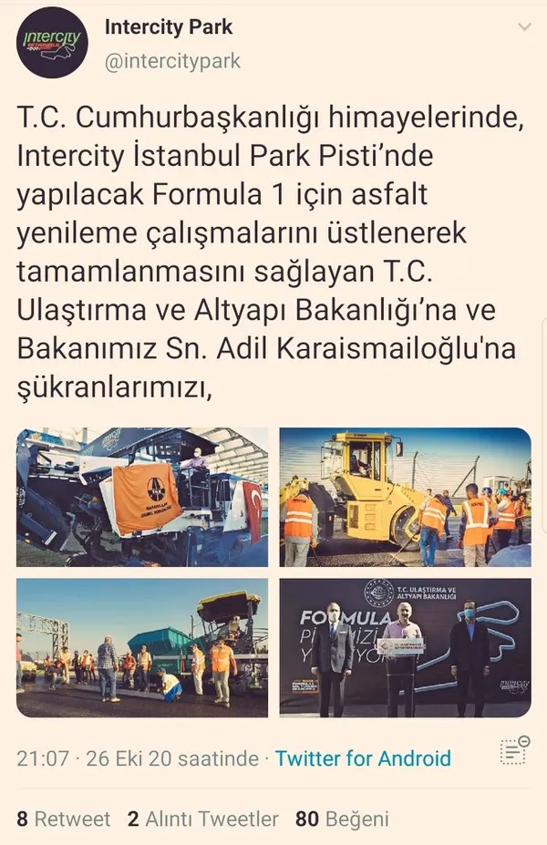Aynı gün Intercity İstanbul Park Pisti'nin Twitter hesabı olan @intercitypark'tan çalışmayı yapanın Ulaştırma ve Altyapı Bakanlığı olduğu ifade edildi. Aynı sosyal medya hesabından yapılan açıklamada ise "T.C. Cumhurbaşkanlığı himayelerinde, Intercity İstanbul Park Pisti'nde yapılacak Formula 1 için asfalt yenileme çalışmalarını üstlenerek tamamlanmasını sağlayan T.C. Ulaştırma ve Altyapı Bakanlığı'na ve Bakanımız Sayın Adil Karaismailoğlu'na şükranlarımızı, pistte gece gündüz çalışan Karayolları Genel Müdürlüğü ekiplerine de teşekkürlerimizi sunuyoruz" ifadeleri kullanıldı.