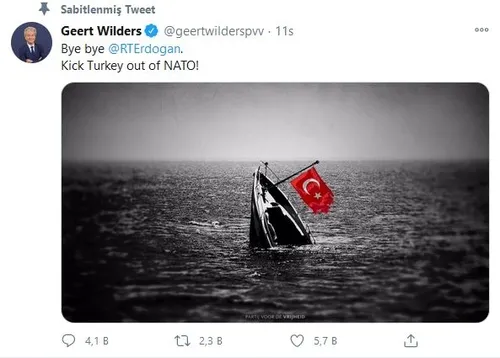 Son dakika haberi: İslamofobik ve ırkçı açıklamalarıyla gündemden düşmeyen Hollanda Özgürlük Partisi Genel Başkanı Geert Wilders yine Türkiye'ye saldırdı. Wilders sosyal medya hesabından yaptığı paylaşım ile Türkiye'nin NATO'dan atılması çağrısında bulundu. Türkiye bayrağı bulunan bir geminin yer aldığı skandal paylaşıma tepki yağdı. Wilders geçtiğimiz günlerde de Başkan Recep Tayyip Erdoğan'a hakaret niteliğindeki bir karikatürü hesabından paylaşmıştı.