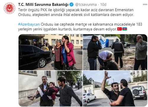 Milli Savunma Bakanlığı sosyal medya hesabından son dakika olarak duyurudu. MSB: Terör örgütü PKK ile işbirliği yapacak kadar aciz davranan Ermenistan Ordusu, ateşkesleri anında ihlal ederek sivil katliamlara devam ediyor. Azerbaycan Ordusu ise cephede mertçe ve kahramanca mücadeleyle 183 yerleşim yerini işgalden kurtardı, kurtarmaya devam ediyor.
