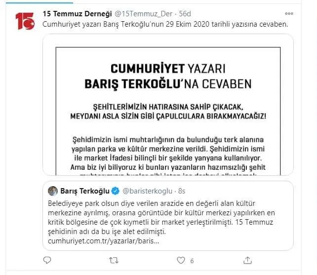 15 Temmuz Derneği; sosyal paylaşım sitesi Twitter'daki resmi hesabından açıklama bulundu ve Cumhuriyet Gazetesi yazarı Barış Terkoğlu'nun 29 Ekim 2020 tarihli yazısına cevap verildiğini açıkladı.