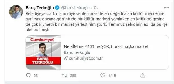"Şehidimizin ismi muhtarlığının da bulunduğu terk alanına yapılan parka ve kültür merkezine verildi. Şehidimizin ismi ile market İfadesi bilinçli bir şekilde yan yana kullanılıyor. Ama biz iyi biliyoruz ki bunları yazanların hazımsızlığı şehit muhtarımızın bunlar gibi içten içe darbeyi alkışlamak yerine, yüreklice darbeci alçak teröristlere karşı duruşundan kaynaklanıyor. Bunu bir türlü içlerine sindiremiyorlar."
