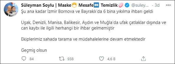 İzmir'de meydana gelen şiddetli depremin ardından İçişleri Bakanı Süleyman Soylu 6 binanın yıkıldığı ihbarının geldiğini sosyal medyadan duyurdu.
