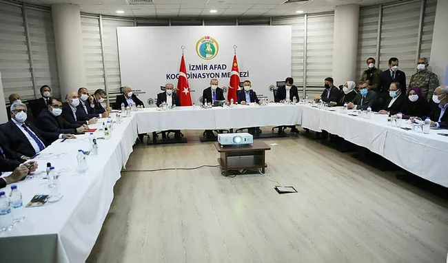 Cumhurbaşkanı Erdoğan'a burada yetkililer tarafından brifing verildi. Toplantıda TBMM Başkanı Mustafa Şentop, Cumhurbaşkanı Yardımcısı Fuat Oktay ile deprem bölgesinde bulunan bakanlar da yer aldı.