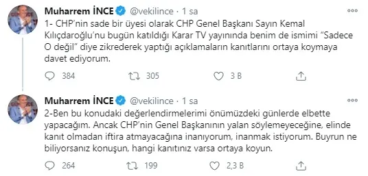 "CHP'nin sade bir üyesi olarak CHP Genel Başkanı Sayın Kemal Kılıçdaroğlu'nu bugün katıldığı Karar TV yayınında benim de ismimi "Sadece O değil" diye zikrederek yaptığı açıklamaların kanıtlarını ortaya koymaya davet ediyorum."