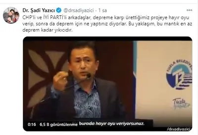 Şadi Yazıcı, "30 bin metre karelik bir alan rezerv alan ilan etmişiz. 40 yıllık davalık yeri çözüyoruz. Siz burada 'Hayır' oyu veriyorsunuz. Ondan sonra da komik bir şekilde 'Deprem için ne yaptın?' diye soruyorsunuz. Burada da gelip ondan sonra bize de hesap sormaya kalkıyorsunuz. Buyurun, o evlerin hepsi 40 yıllık bina, hepsi yıkılacak bina, insan bunun için bile sadece şurada evet verir" dedi.