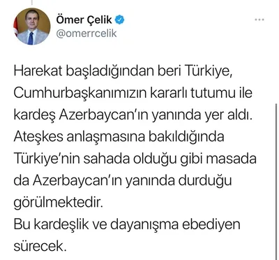 Çelik sözlerine şöyle devam etti: "Harekat başladığından beri Türkiye, Cumhurbaşkanımızın kararlı tutumu ile kardeş Azerbaycan'ın yanında yer aldı. Ateşkes anlaşmasına bakıldığında Türkiye'nin sahada olduğu gibi masada da Azerbaycan'ın yanında durduğu görülmektedir. Bu kardeşlik ve dayanışma ebediyen sürecek."