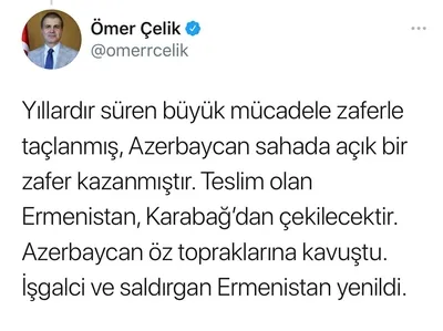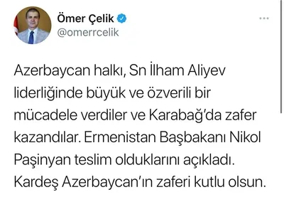 AK Parti Sözcüsü Ömer Çelik de sosyal medya hesabından konuyla alakalı bir açıklama yayınladı. Çelik, "Azerbaycan halkı, sayın İlham Aliyev liderliğinde büyük ve özverili bir mücadele verdiler ve Karabağ'da zafer kazandılar. Ermenistan Başbakanı Nikol Paşinyan teslim olduklarını açıkladı. Kardeş Azerbaycan'ın zaferi kutlu olsun. Yıllardır süren büyük mücadele zaferle taçlanmış, Azerbaycan sahada açık bir zafer kazanmıştır. Teslim olan Ermenistan, Karabağ'dan çekilecektir. Azerbaycan öz topraklarına kavuştu. İşgalci ve saldırgan Ermenistan yenildi" dedi.