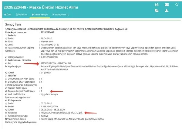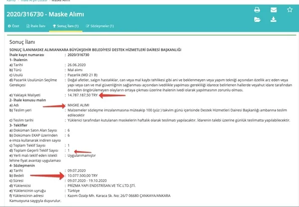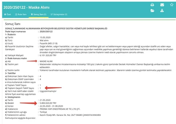 Ankara Büyükşehir Belediyesi farklı tarihlerde üç adet maske ihalesi açtı. Bu ihalelere tek bir firma katıldı. Katılan firmanın inşaat firması olduğu ortaya çıktı. Bir inşaat şirketi olan Prizma Yapı Endüstrisi ve Ticaret Limited Şirketi'nin üç maske ihalesine davet edilmesi ve ihaleye tek katılması tepki çekti.