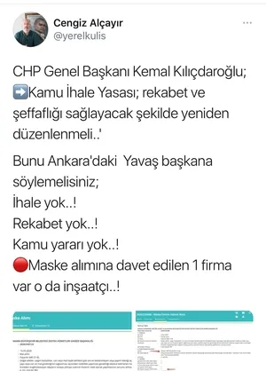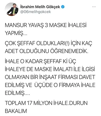 Farklı tarihlerde üç maske ihalesi açan Ankara Büyükşehir Belediyesi, tek bir şirketi ihaleye davet etti. Maska ihalesine katılan şirketin inşaat şirketi olduğu ortaya çıktı. Üç ihalenin toplamının yaklaşık 17 milyon lira olduğu öğrenildi. Bu üç ihaleye sosyal medyadan tepki gösterildi.