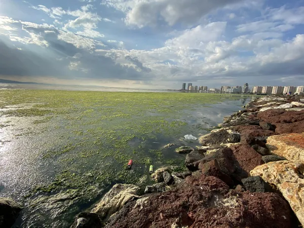 İzmir'in Karşıyaka ilçesi Bostanlı sahilinde deniz suyunun yeşil su birikintisi ile kaplandığını görünce şaşkınlığını gizleyemedi.