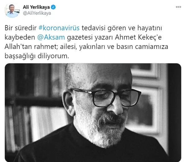 "Bir süredir #koronavirüs tedavisi gören ve hayatını kaybeden Aksam gazetesi yazarı Ahmet Kekeç'e Allah'tan rahmet; ailesi, yakınları ve basın camiamıza başsağlığı diliyorum."